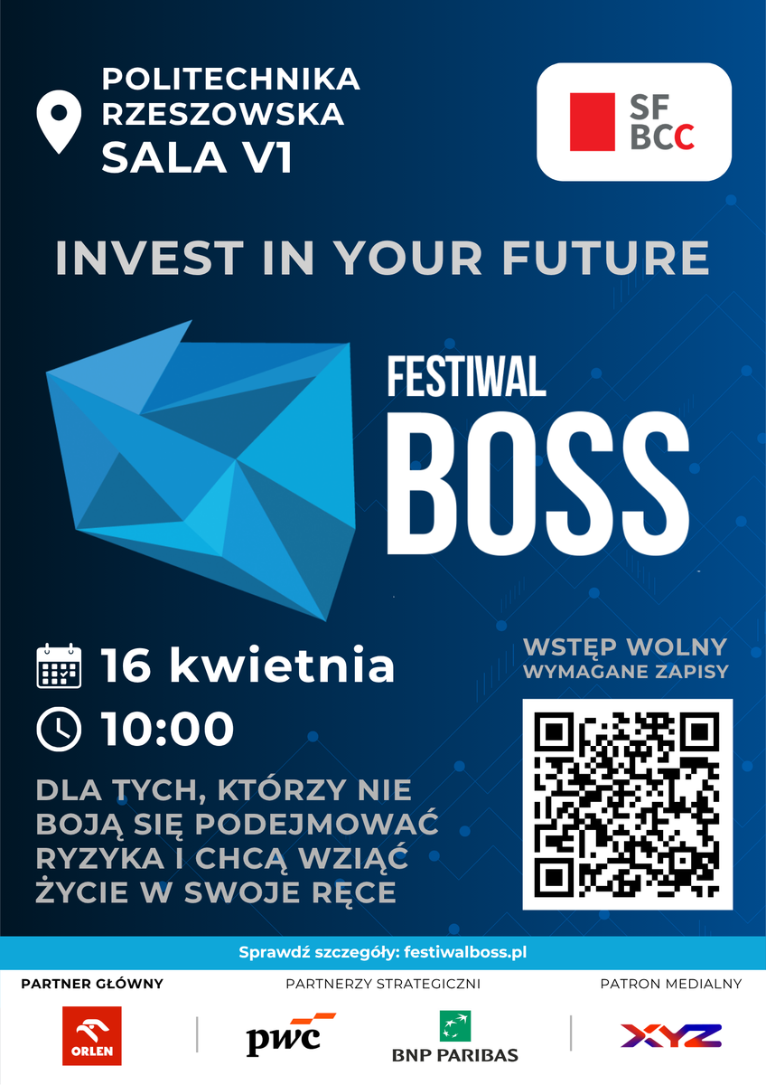 16 kwietnia 2026 r. Politechnika Rzeszowska stanie się miejscem spotkania studentów, młodych ludzi ambitnie myślących o swojej przyszłości oraz praktyków biznesu. W Auli V1 odbędzie się rzeszowska odsłona 20. edycji Festiwalu BOSS – ogólnopolskiego wydarzenia poświęconego przedsiębiorczości, rozwojowi kariery i nowoczesnemu podejściu do rynku pracy.